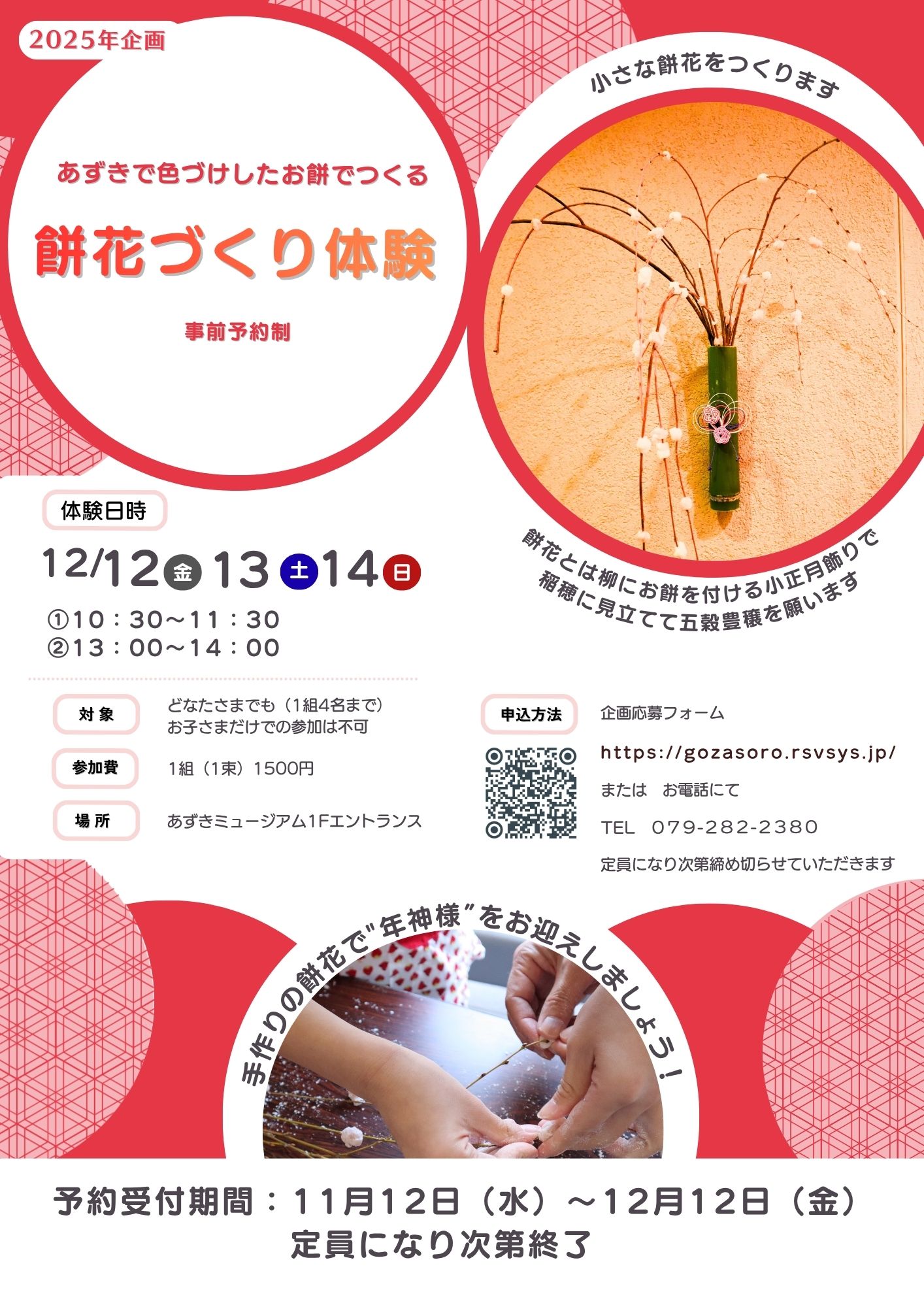 予約方法が分からない場合は、お電話で受け付けさせていただきます。予約期間 11月12日(水)~12月12日(金)(定員になり次第受付終了) キャンセル 実施日の3日前23時59分まで。