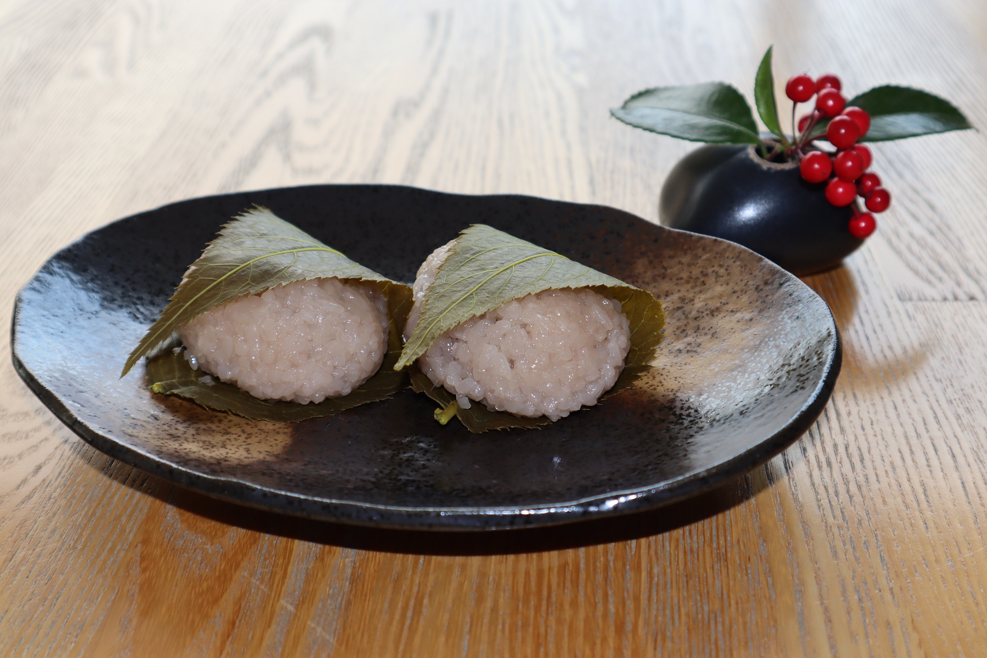 道明寺粉を使った生地で御座候の赤あんを包み、塩漬けした桜葉を巻いて作ります。